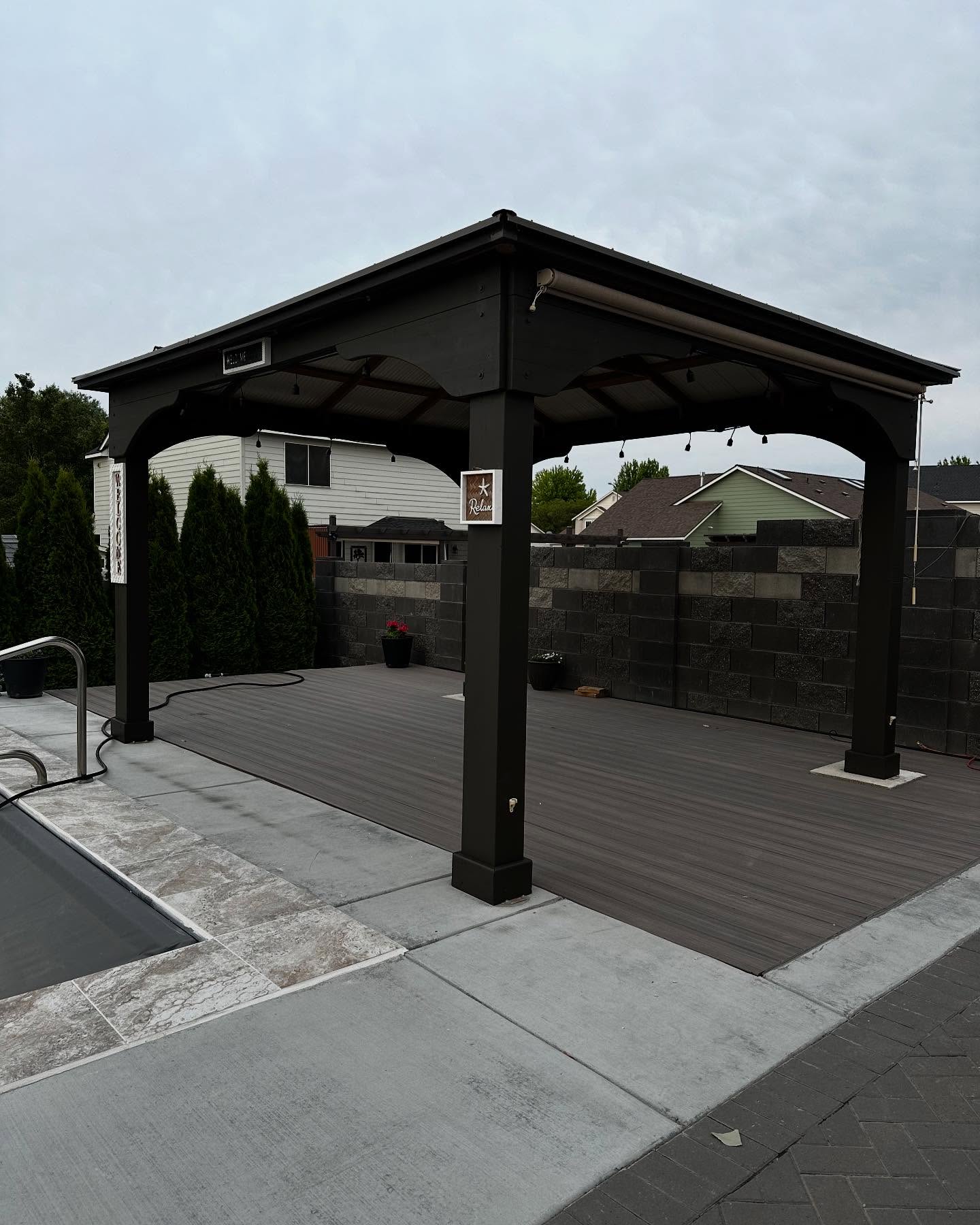 Stained and Sealed Pergola with Expert stain and seal premium semi solid stain with lback color.